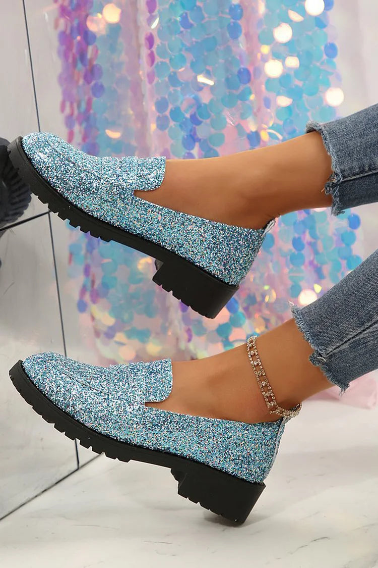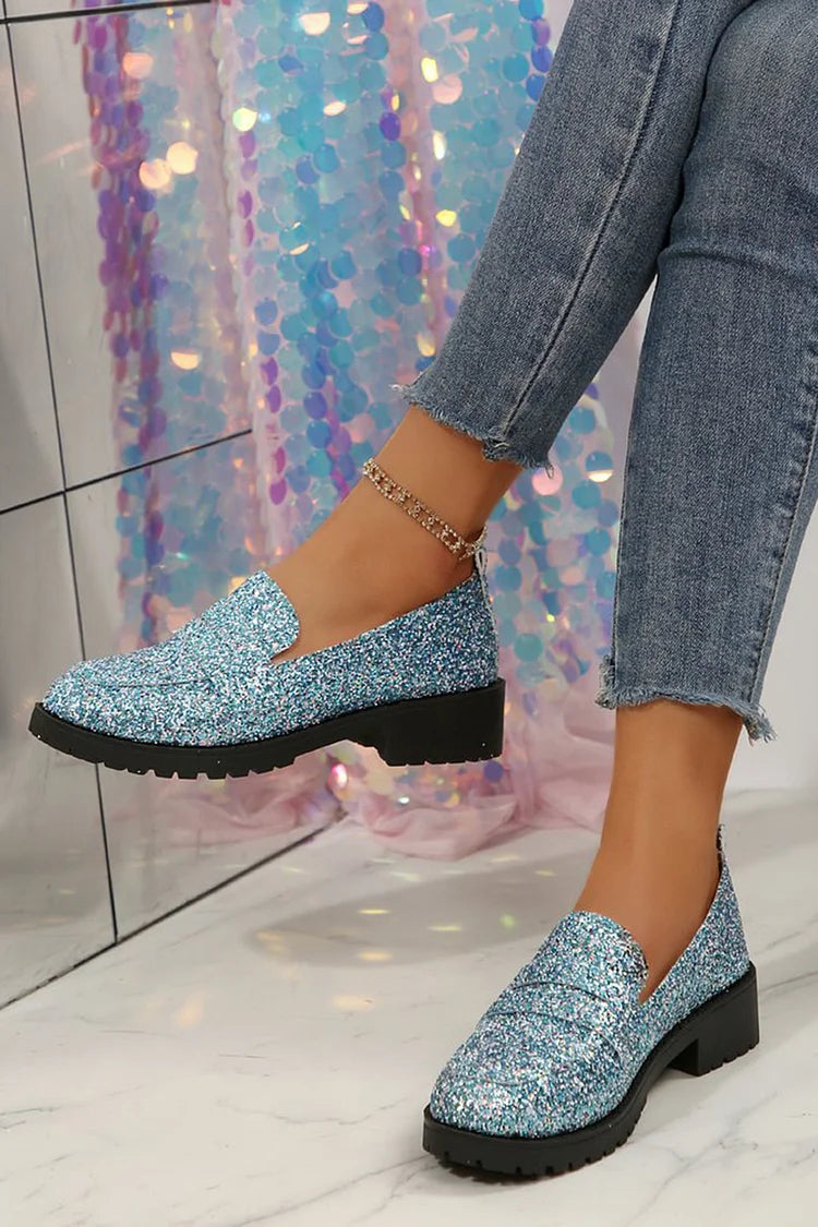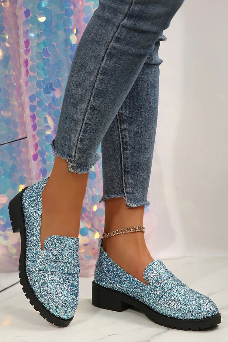 Brokatowe mokasyny typu slip-on z okrągłym noskiem, niskim blokowym obcasem i wzorem patchworkowym