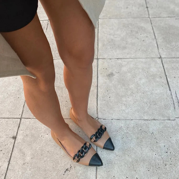Brązowe baleriny z metalowym łańcuszkiem, czubkiem w kontrastowym kolorze [Przedsprzedaż]