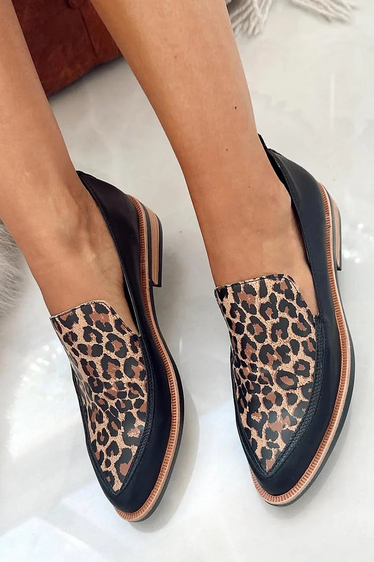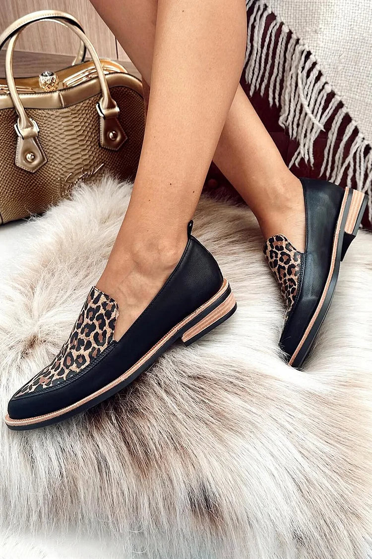 Czarne mokasyny w panterkę z ostrym noskiem i bocznym wycięciem w kształcie litery V [Przedsprzedaż]