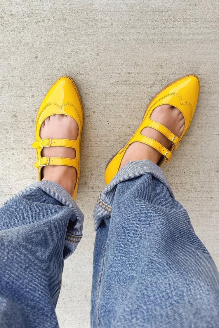 Żółte baleriny z dwoma paskami, klamrą, szpiczastym noskiem i patchworkiem [Przedsprzedaż]