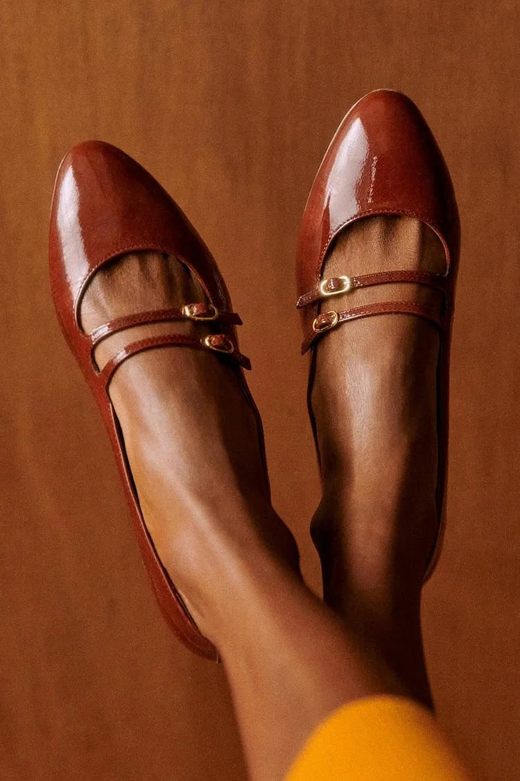 Dwa paski klamry jednokolorowe brązowe baleriny z okrągłym noskiem [Przedsprzedaż]