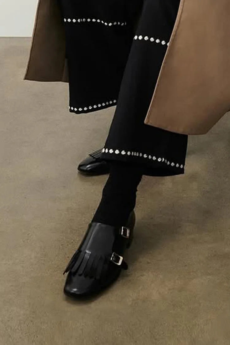 Klamry Frędzle Gładki Kolor Okrągły Nosek Czarne Mokasyny [Przedsprzedaż]