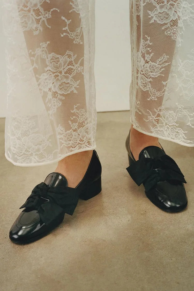 Ozdoba w kształcie kokardy, czarne loafersy z okrągłym noskiem i niskim, szerokim obcasem [Przedsprzedaż]