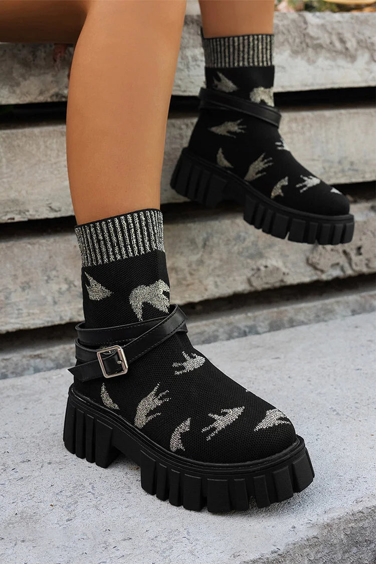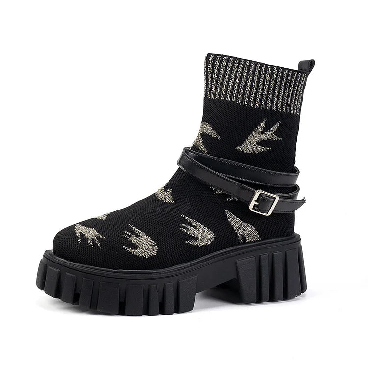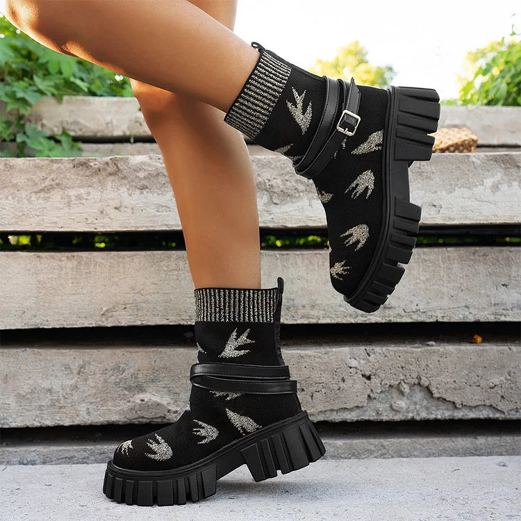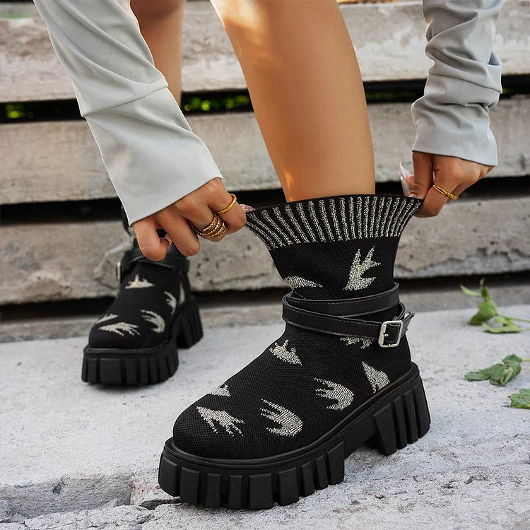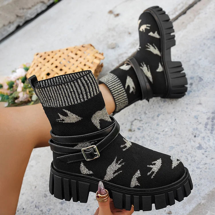 Kolorowy pasek z klamrą, dekoracja, okrągły nosek, masywny obcas, botki do połowy łydki