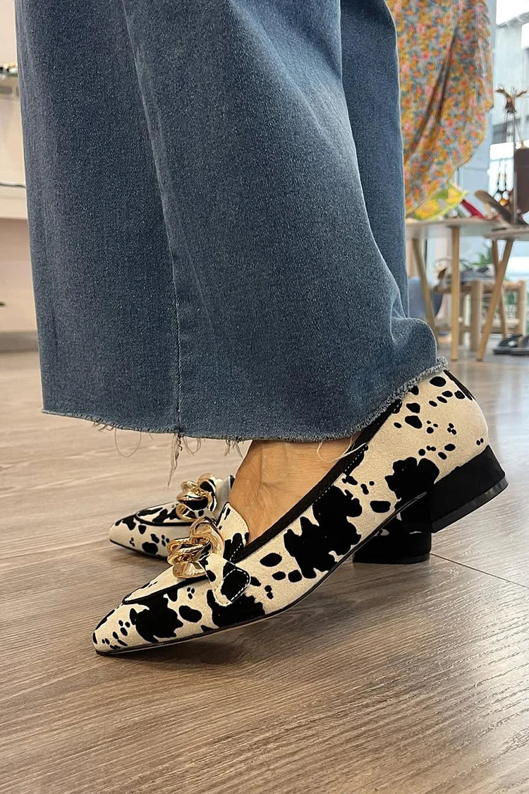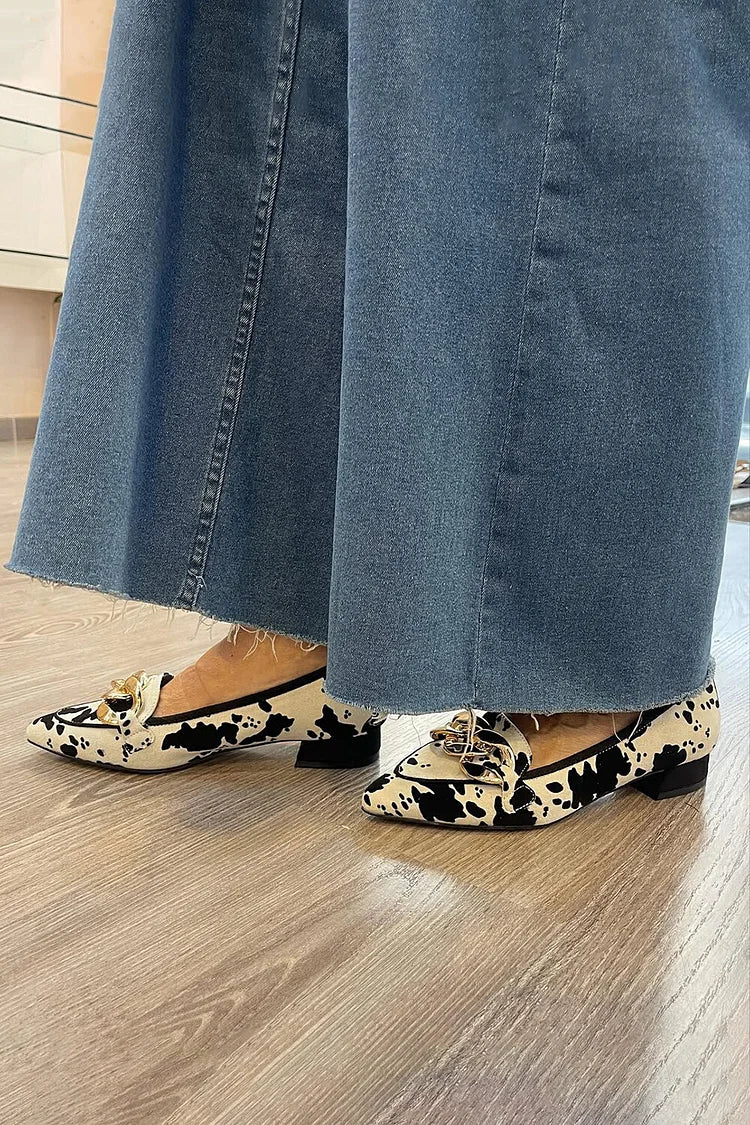 Beżowe mokasyny z metalowym łańcuchem i wzorem w krowie cętki, z ostrym noskiem [Przedsprzedaż]