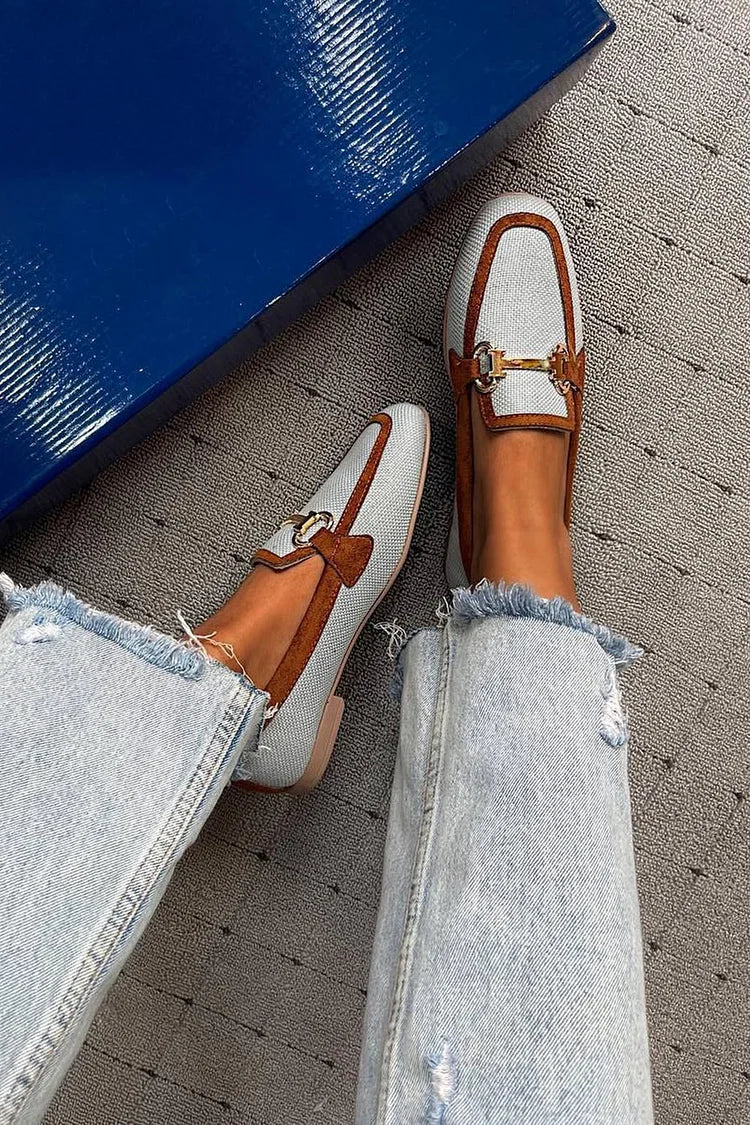 Metalowe dekoracje, mokasyny w kolorze jasnoszarym z kwadratowym noskiem i blokiem kolorów [Przedsprzedaż]
