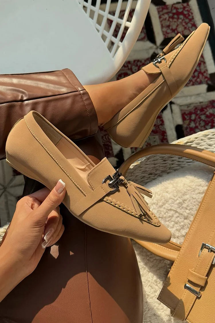 Metalowe klamry, frędzle, dekoracja, mokasyny khaki z ostrym noskiem [Przedsprzedaż]