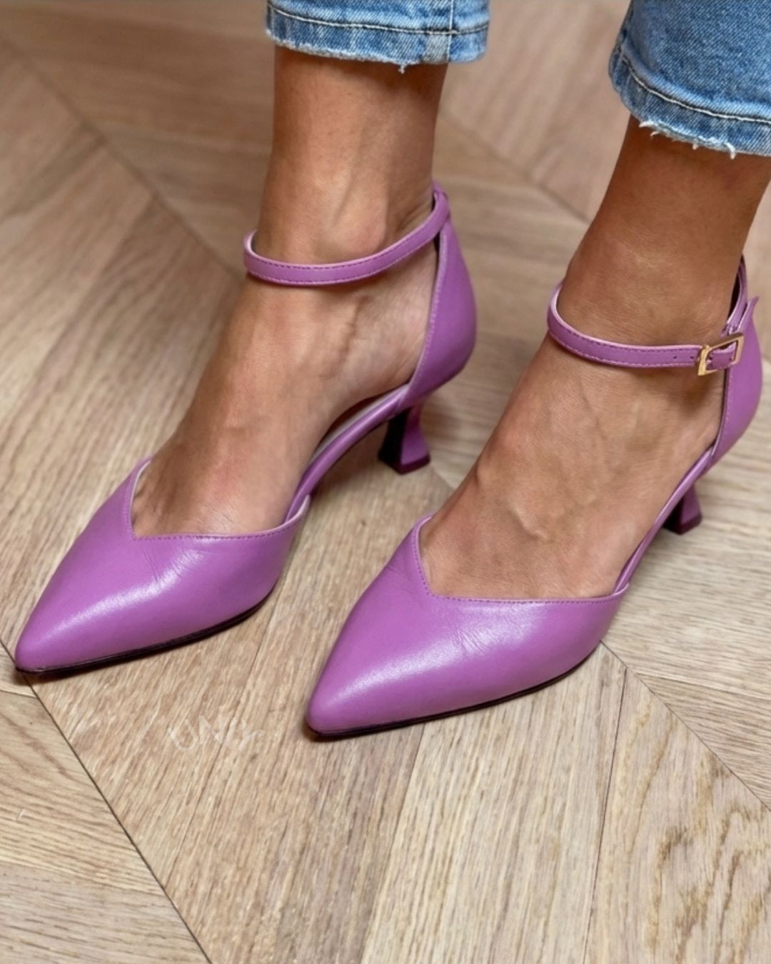 Stylowe fioletowe sandały na obcasie z paskiem wokół kostki i wycięciem w kształcie litery V [Przedsprzedaż]