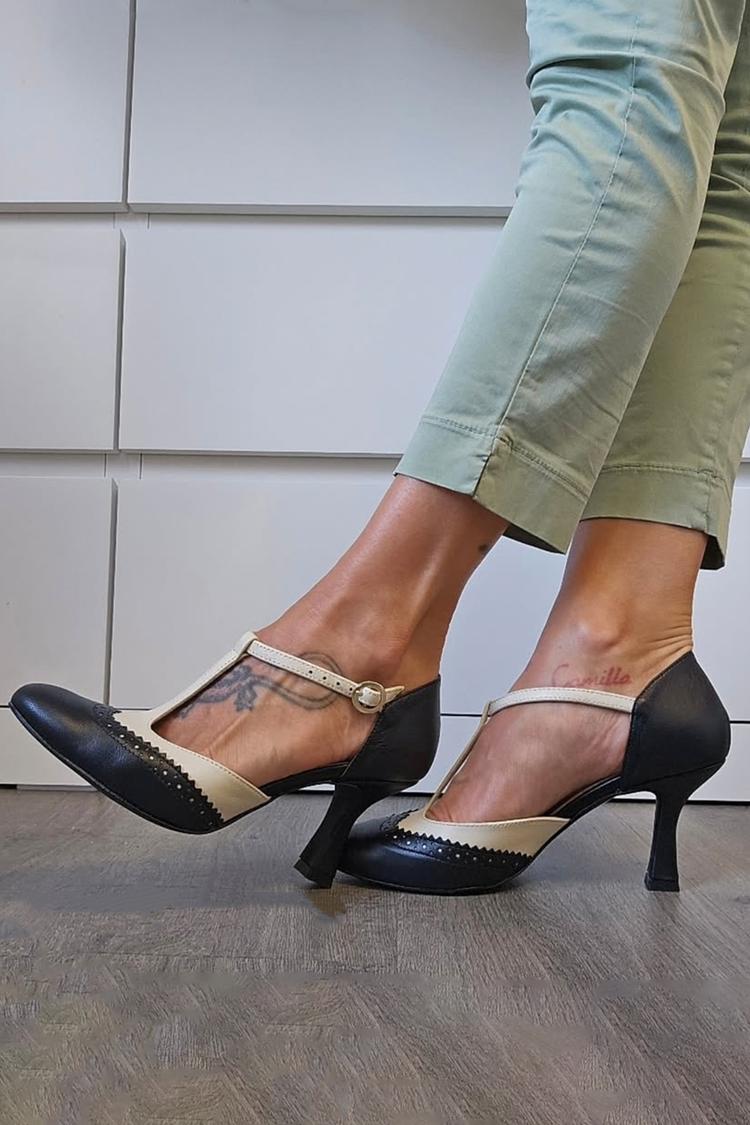 Czarny szpilki z paskiem T, klamrą, kolorowym blokiem i okrągłym noskiem [Przedsprzedaż]