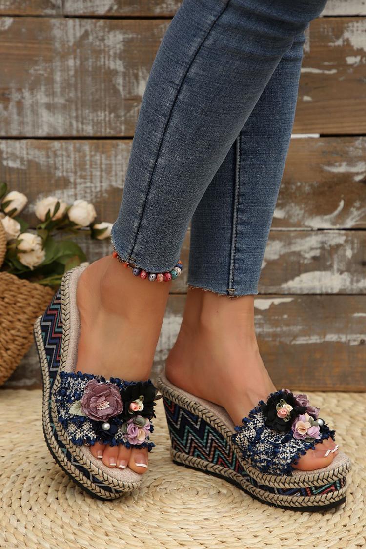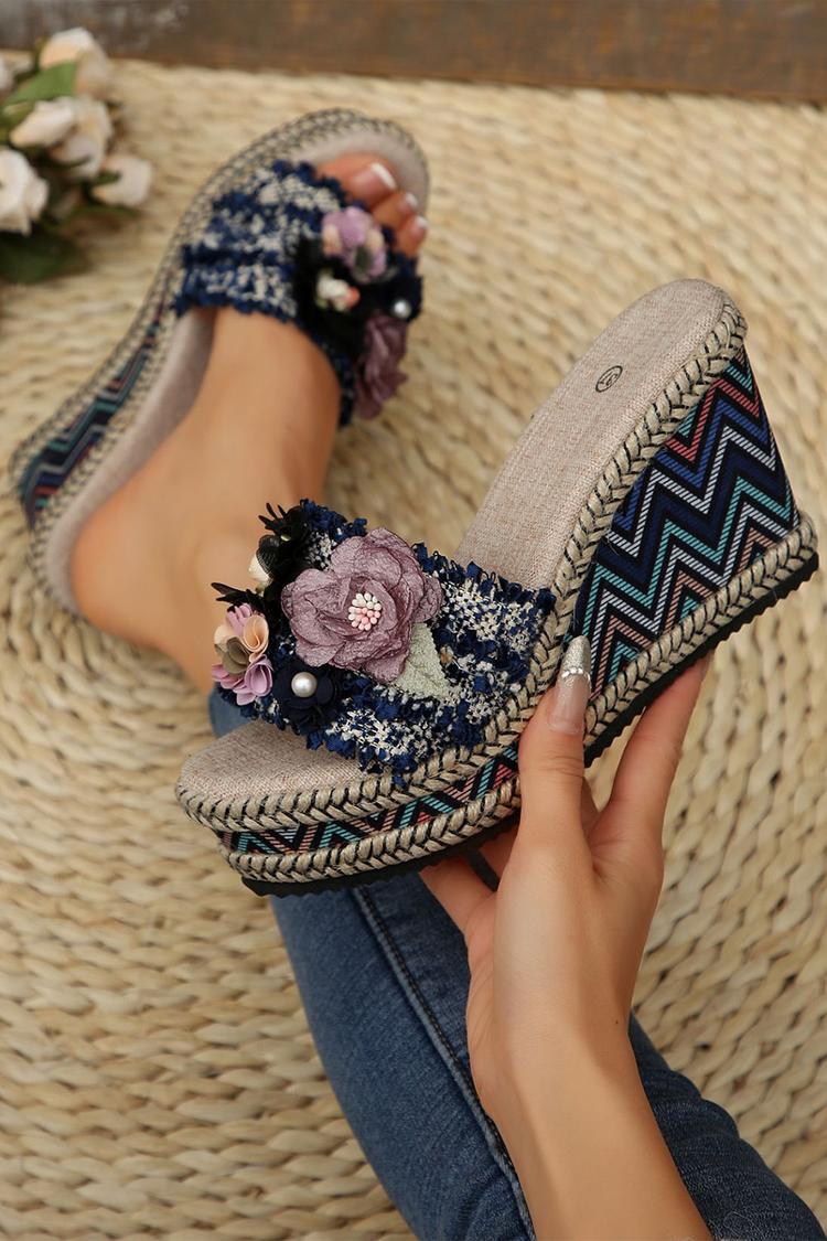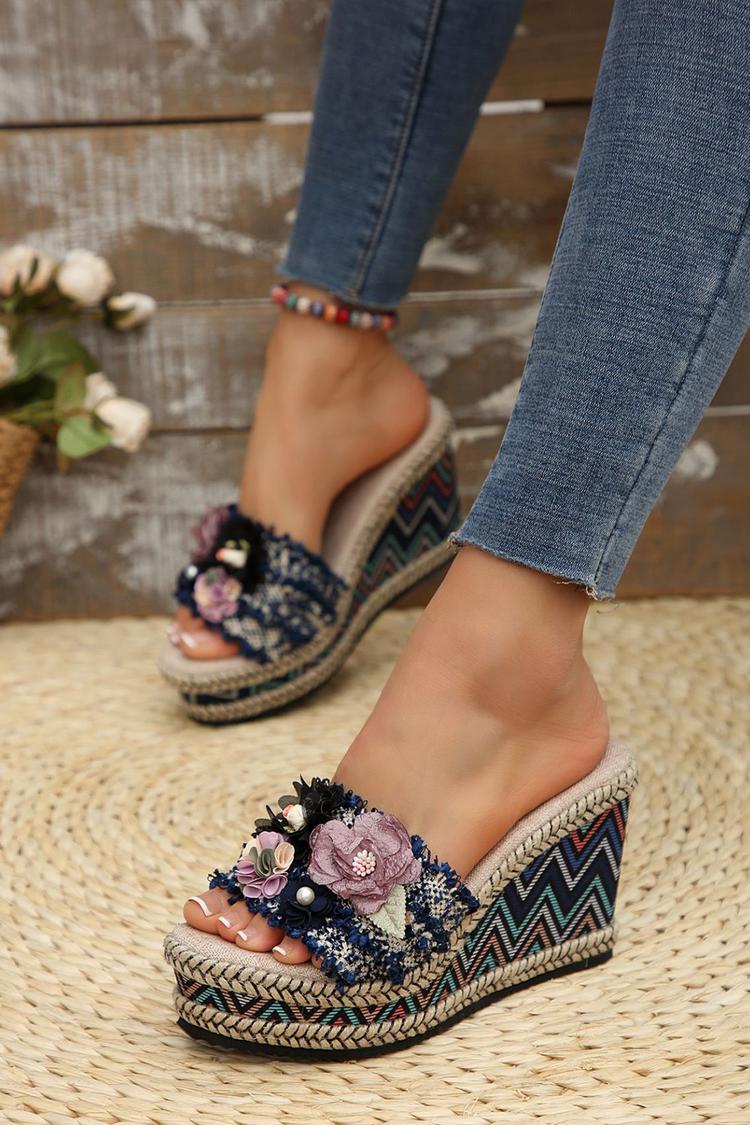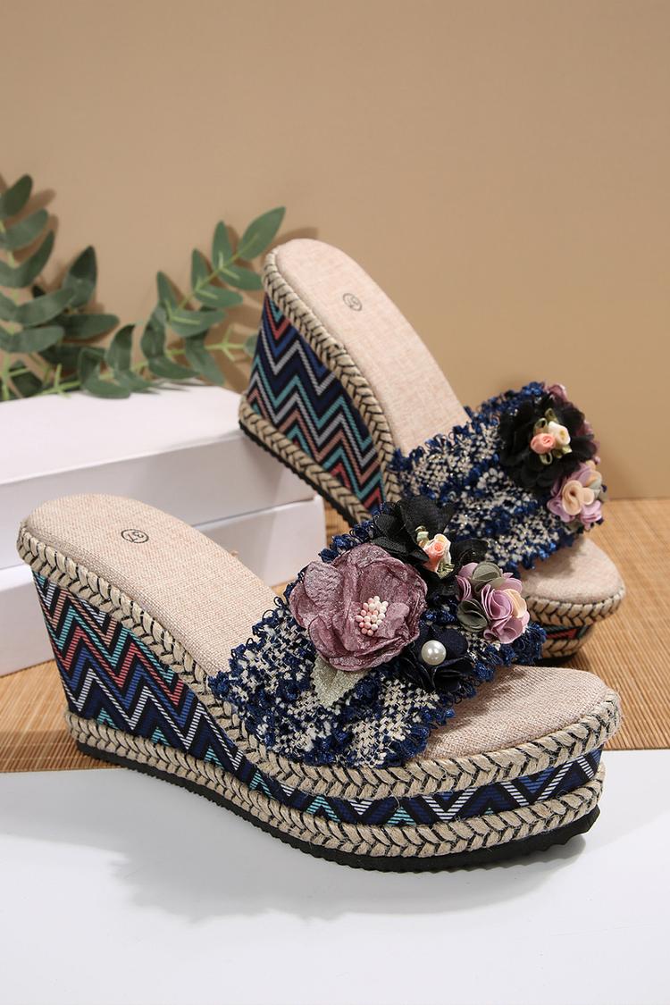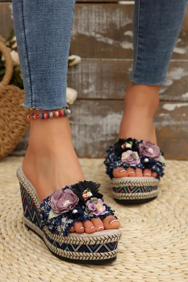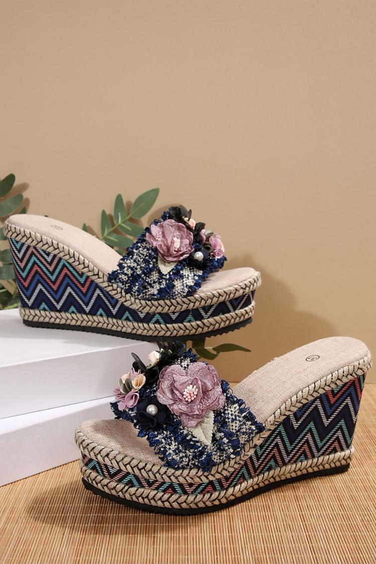 Wielokolorowa 3D dekoracja kwiatowa, okrągły nosek, casualowe, na zewnątrz, koturny na obcasie