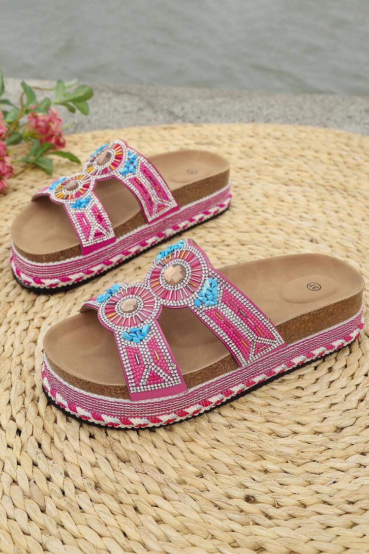 Kolorowe klapki na platformie z okrągłym noskiem i dekoracją z kryształków na plażę