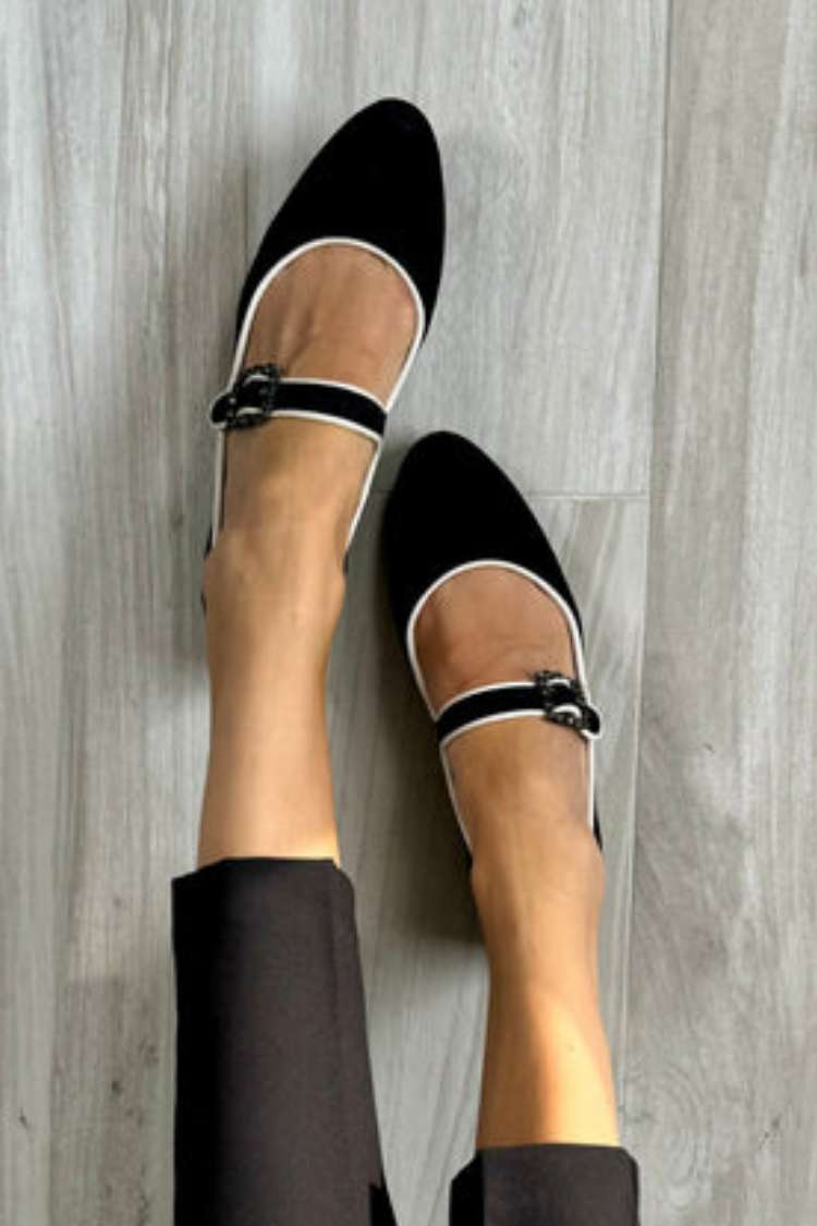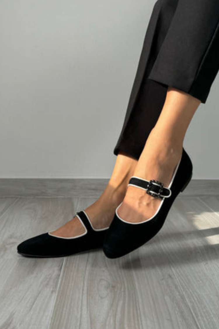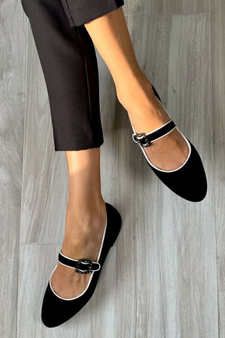 Zamszowe baleriny Mary Jane z kontrastową lamówką i klamrą [Przedsprzedaż]