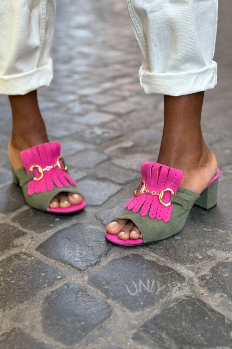 Chic Green Fuchsia Suede Horsebit Fringe Block Heel Mules [Pre Order]