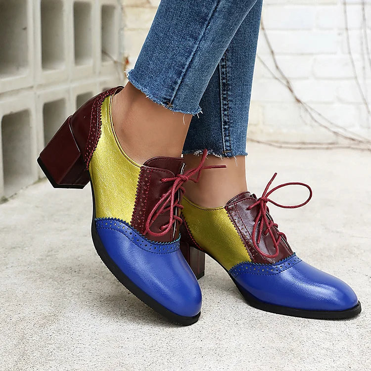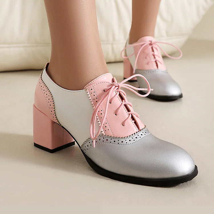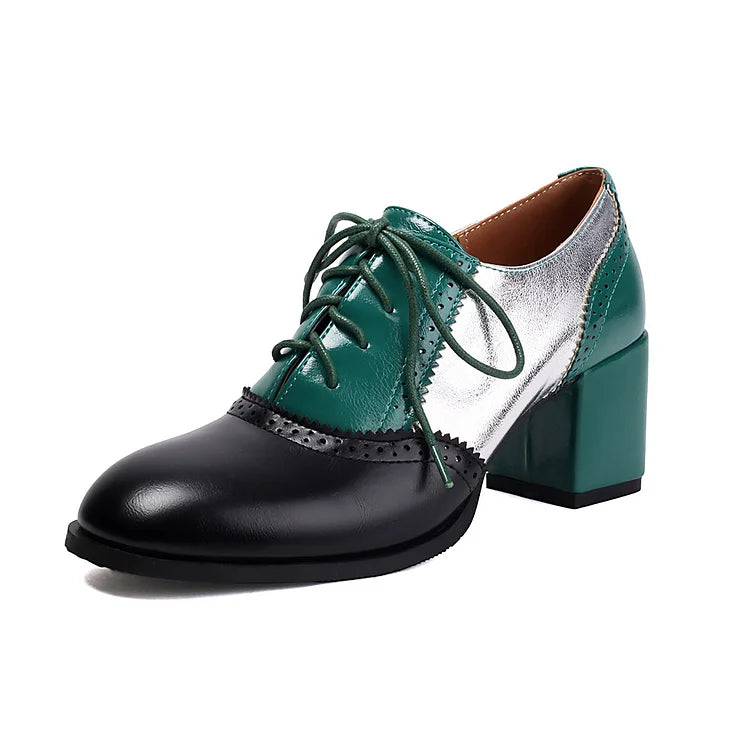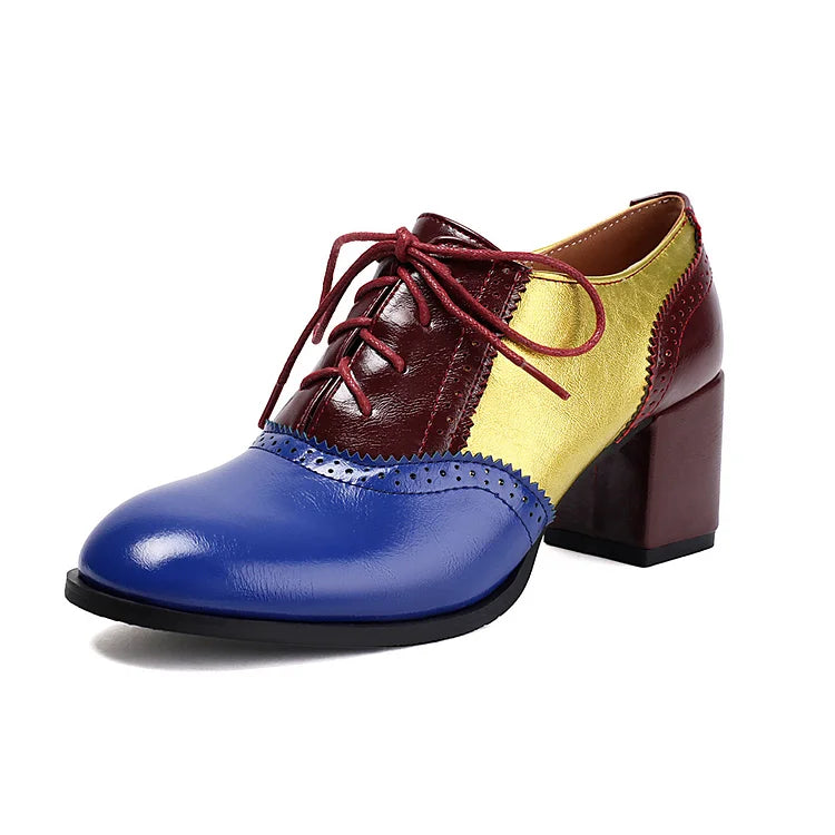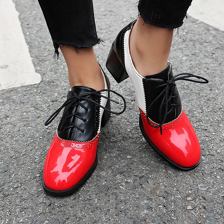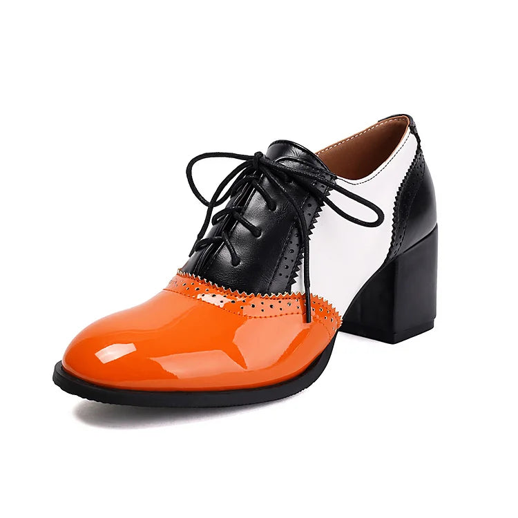 Lace Up Colorblock Round Toe Chunky Heel Brogue Oxfords
