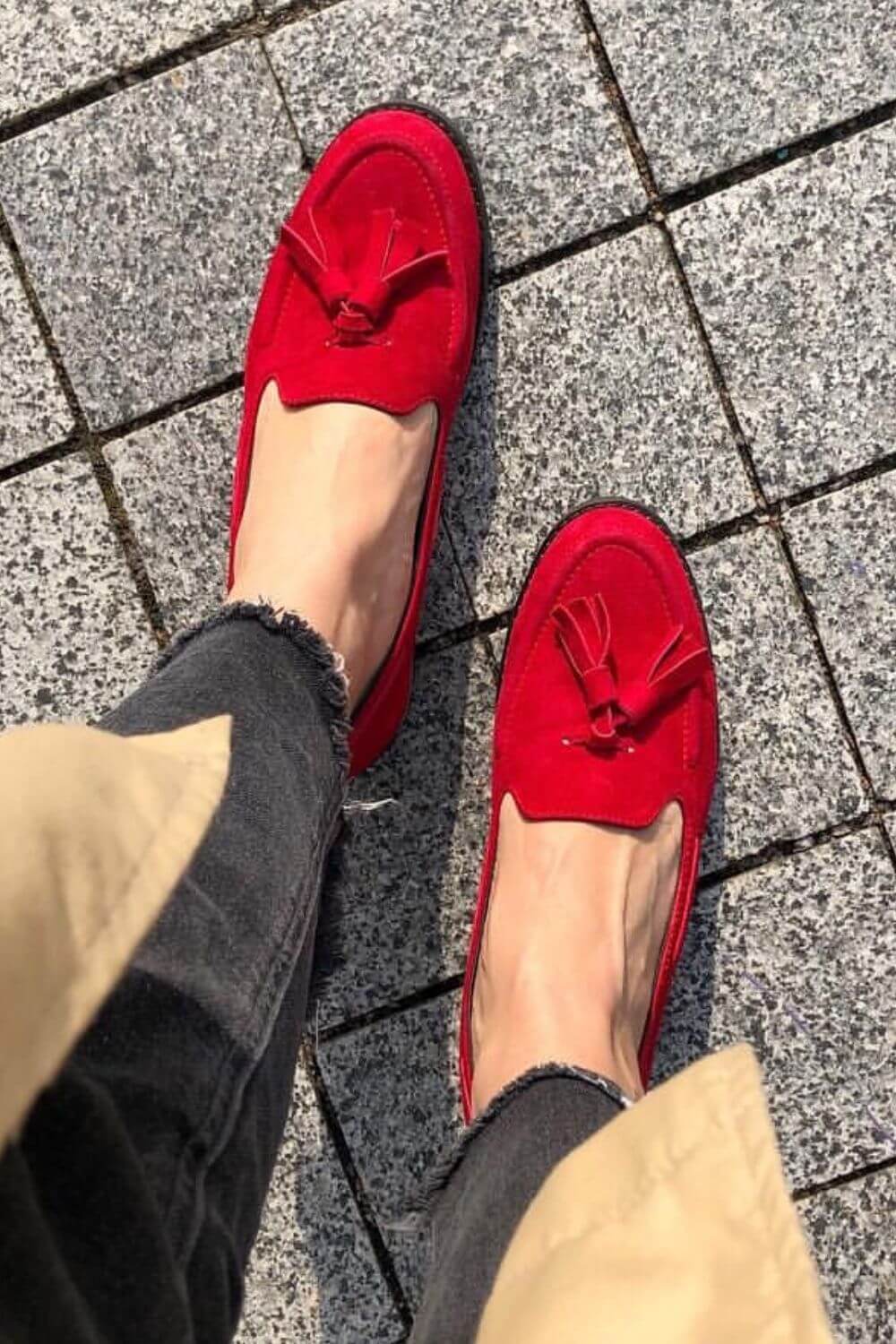 Mocassini in pelle scamosciata con fiocco rosso e punta quadrata [Pre-ordine]