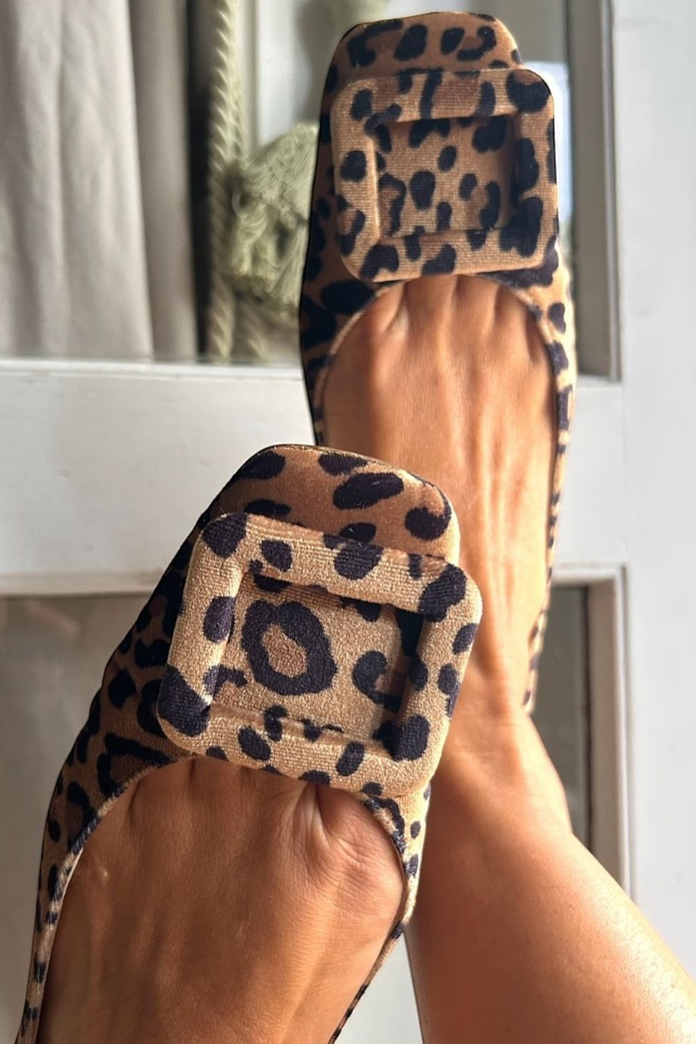 Cinturino alla caviglia con fibbia, stampa leopardata, punta affilata, tacco basso beige