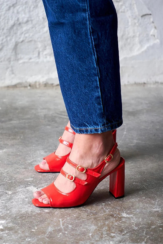 Tiras Quadradas, Parte Superior do Pé, Dois Dedos, Saltos Grossos com Fivelas Vermelhas [Pré-Encomenda]