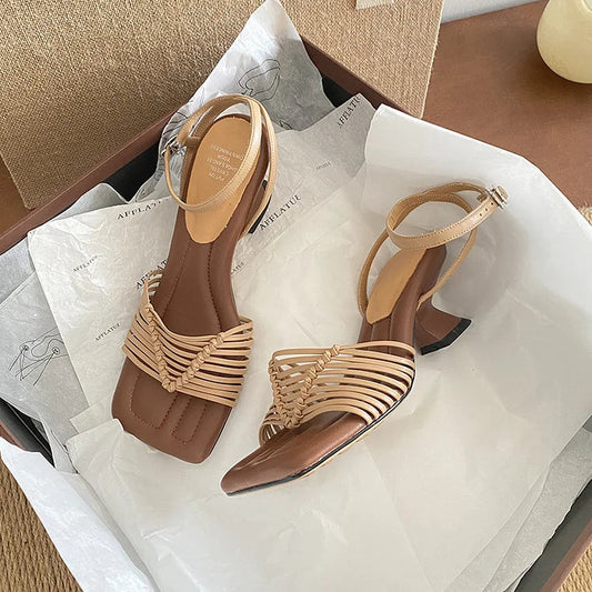 Sandálias Elegantes Casuais de Cor Sólida com Biqueira Quadrada, Tiras e Recortes, Salto Grosso