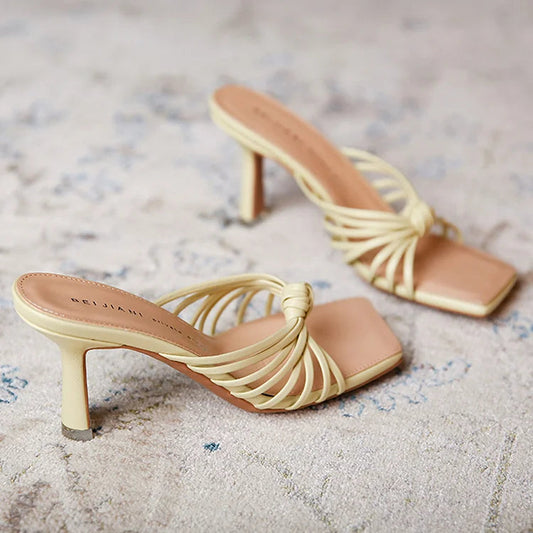Sandálias de salto alto stiletto com tiras, biqueira quadrada lisa, nó e recorte