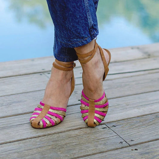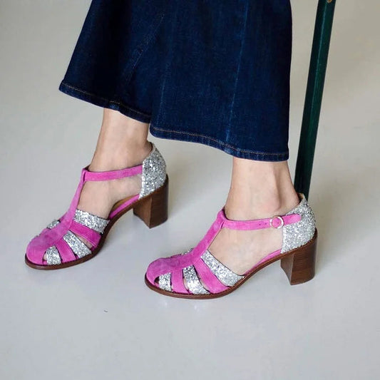 Sandálias de salto grosso fúcsia com tira em T, fivela e brilho em blocos de cor Splendid [Pré-encomenda]