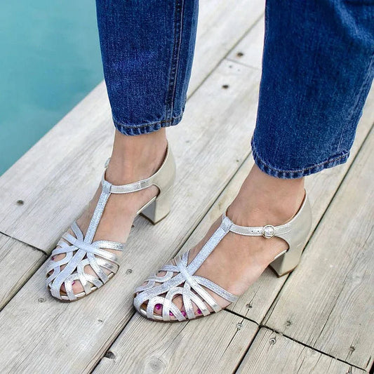 Sandálias de salto grosso redondo com tira em T, fivela, recorte oco e biqueira prateada [Pré-encomenda]