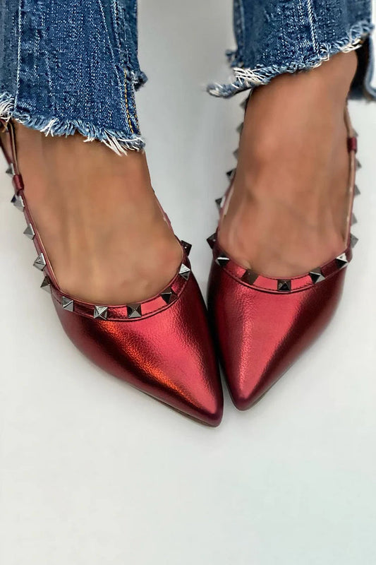 Decoração cravejada com bico fino e tira de estilingue em sapatilhas vermelhas