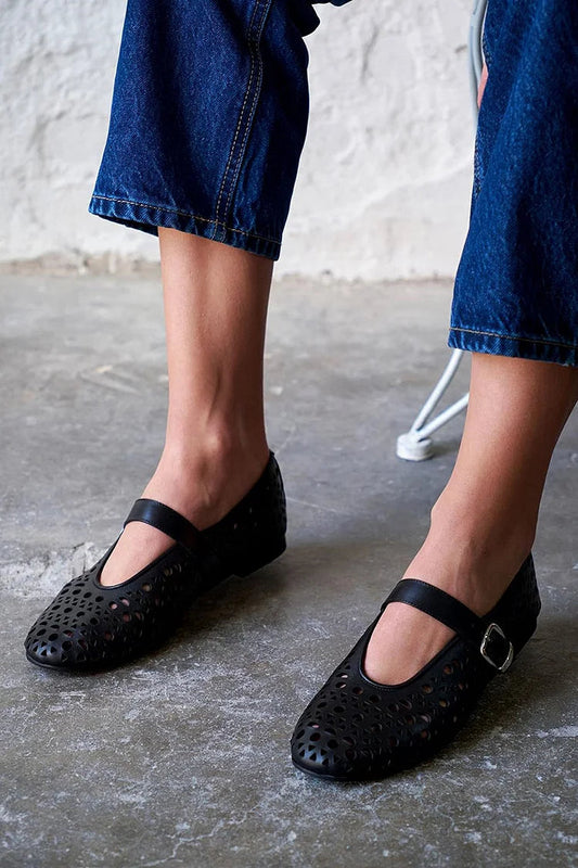 Dedo do pé redondo oco com tira no peito do pé e fivela em sapatilhas pretas