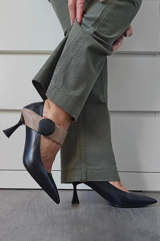 T-Strap Fivela Dedo Apontado Colorblock Preto Salto Grosso