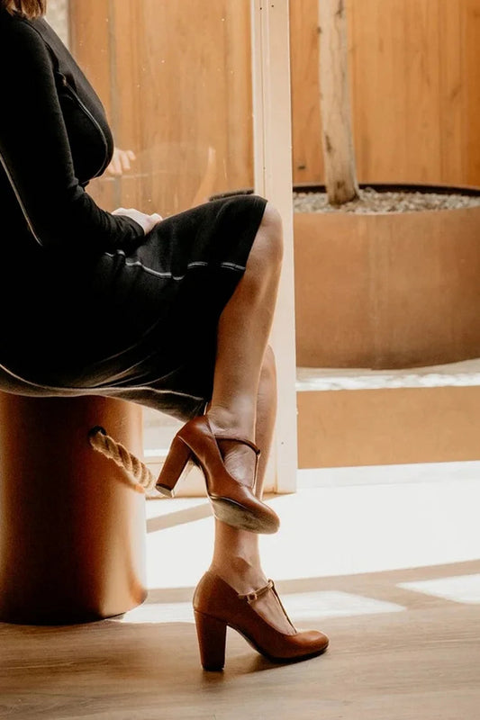 Sapatos de salto médio com biqueira fechada, tira em T e tiras cruzadas em camurça