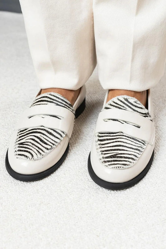 Mocassins brancos com estampa de zebra e bico redondo [Pre Order]