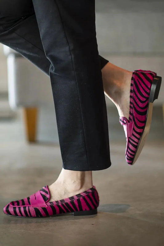 Mocassins fúcsia com estampa de zebra e bico redondo em patchwork [Pre Order]