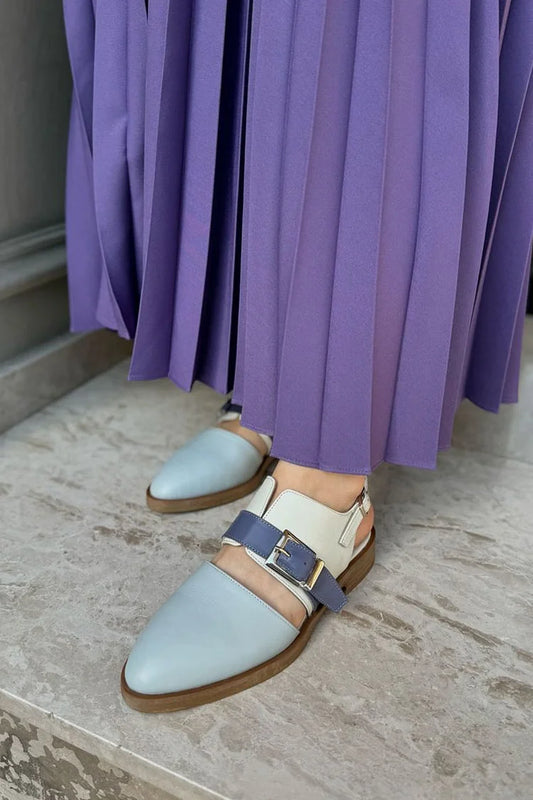 Sabrinas Azuis Claras Premium com Corte, Biqueira Redonda, Tira com Fivela e Bloco de Cores [Pré-Encomenda]