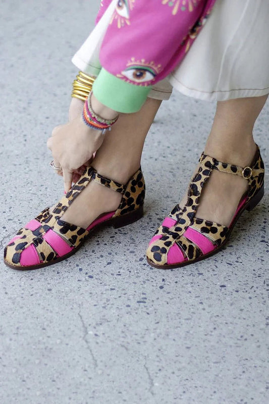 Sabrinas flexíveis com estampa de leopardo, tiras em T, fivela caqui [Pré-encomenda]