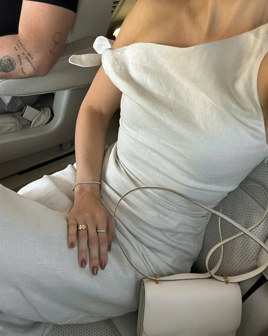 Vestido Casual de Linho e Algodão com Alça Diagonal e Cordão