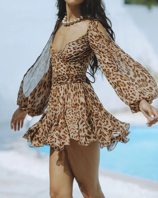 Vestido elegante de chiffon com estampa de leopardo dividido