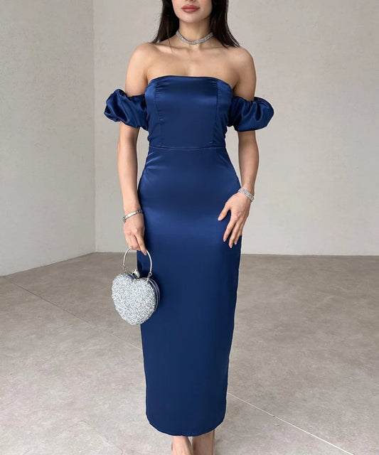 Vestido Elegante de Cor para Festa com Ombro Inclinado Sólido