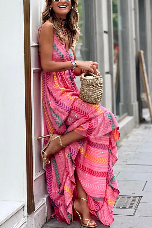 Vestido sem mangas às riscas com decote em V e rosa, requintado para o verão