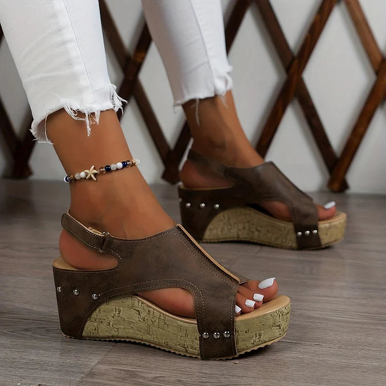 Sandálias Cunha Casuais com Recorte, Tachas Metálicas e Biqueira Aberta